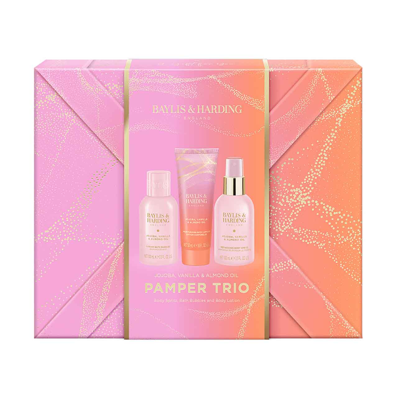 Baylis & Harding Jojoba Vanilla & Almond Oil Wrapped Pamper Trio Experience feminine luxury with this beautifully opulent trio, blending jojoba, rich vanilla, and sweet almond oil.