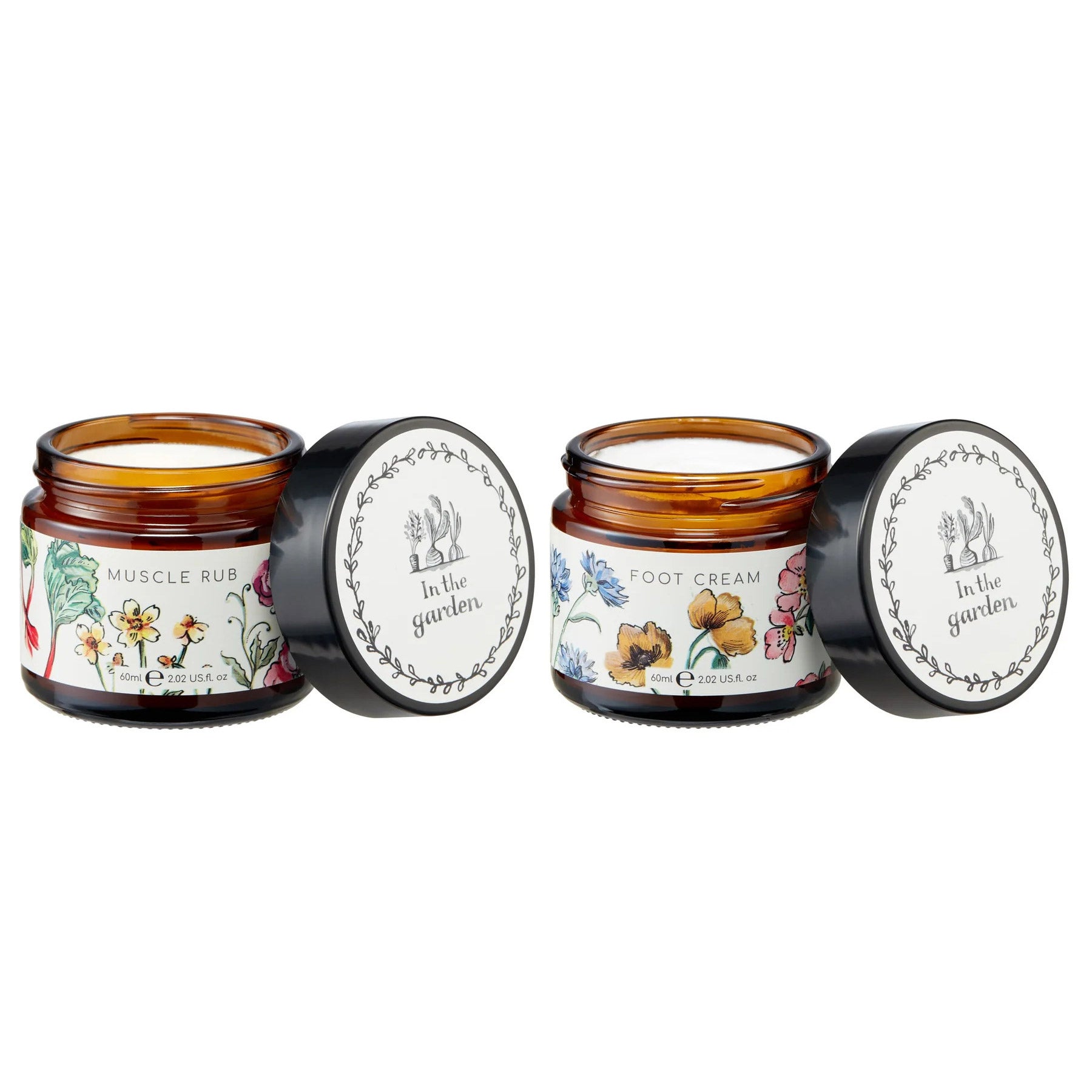The perfect double act of soothing Muscle Rub and cooling Foot Cream with emollient butters and essential oils to relax and refresh tired legs and feet after a rewarding day in the garden.