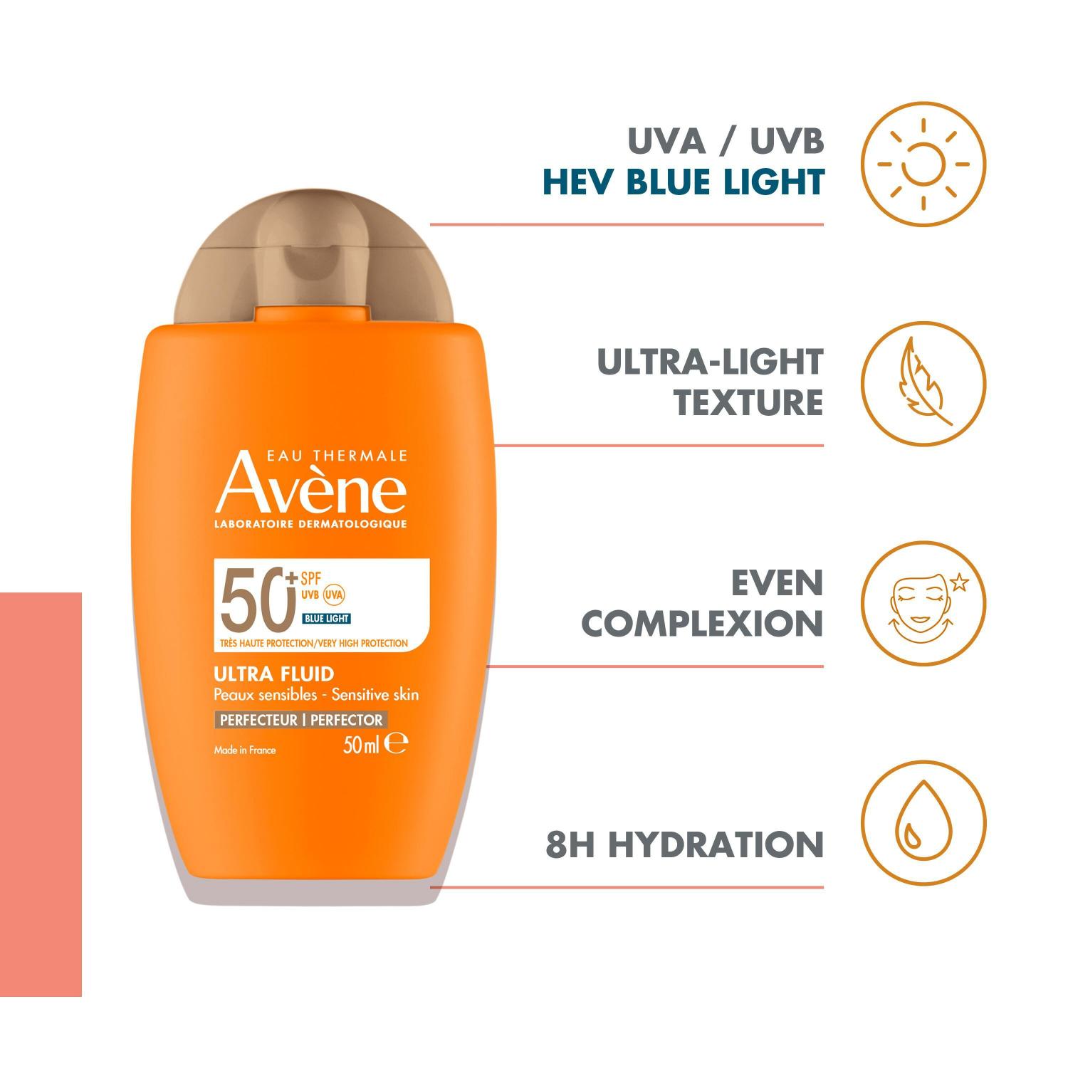 Avène Ultra Fluid Tinted SPF50+ is a lightweight, tinted facial sunscreen designed to provide very high protection against UVB, UVA, and high-energy visible (blue) light. Formulated with TriAsorB™, a broad-spectrum sun filter, it helps prevent skin photoaging while enhancing skin appearance.