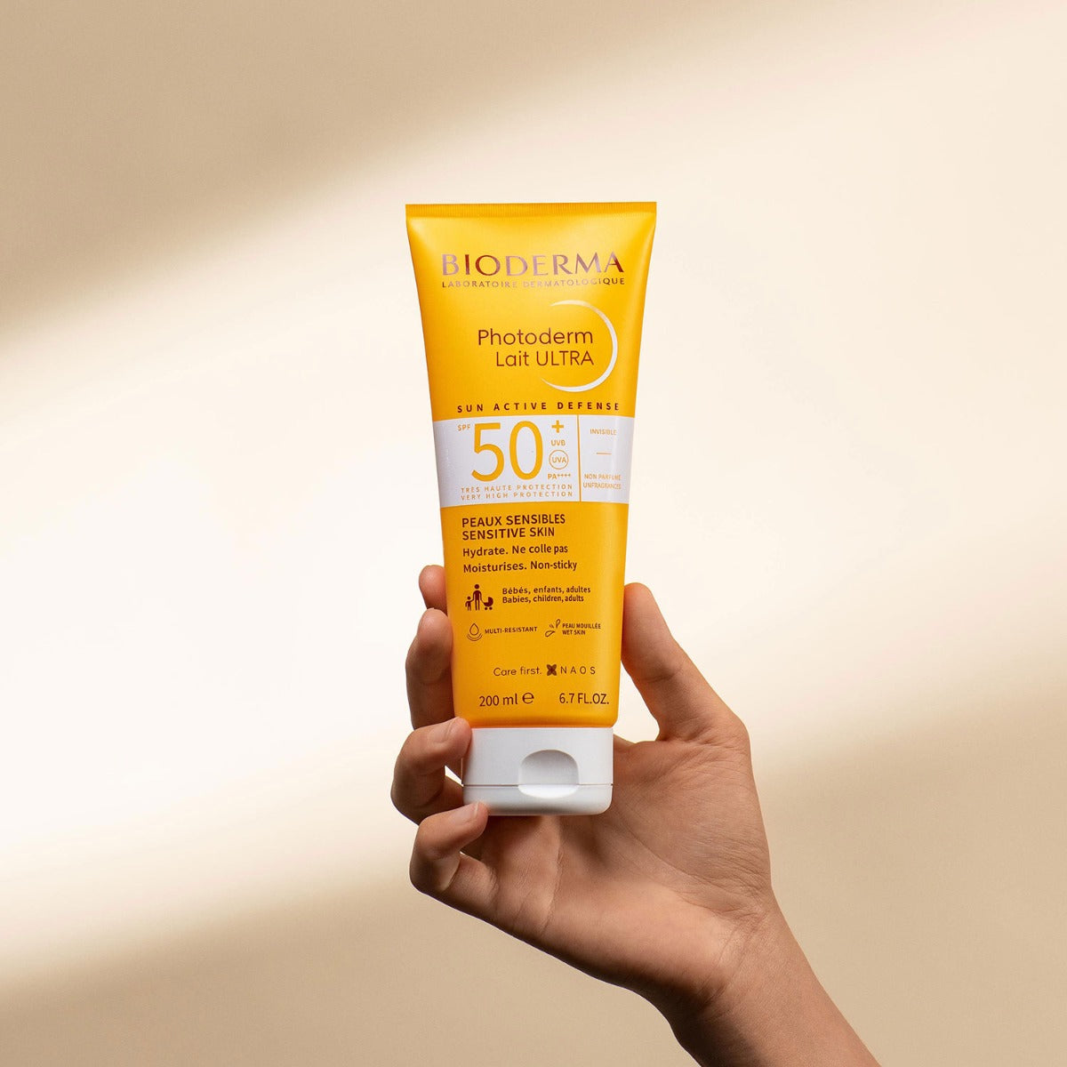Photoderm Lait ULTRA SPF 50+ sunscreen guarantees very high protection reinforced against UVA for sensitive skin even the most vulnerable. Its ultra-light and melting texture provides 8H hydration and invisible finish. Suitable for the whole family.