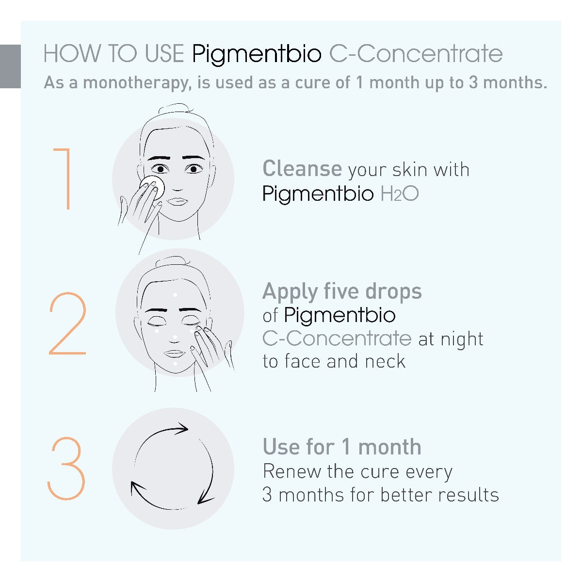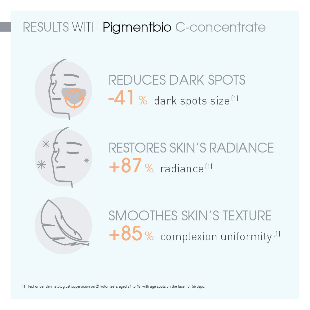 Pigmentbio C-Concentrate is a high security Vitamin C cure, supplemented by a cocktail of vitamins which protect and strengthen the skin barrier. Its high AHA/BHA concentration provides a gentle, peeling-like efficacy. Light and envelopping gel-cream texture. Non comedogenic.