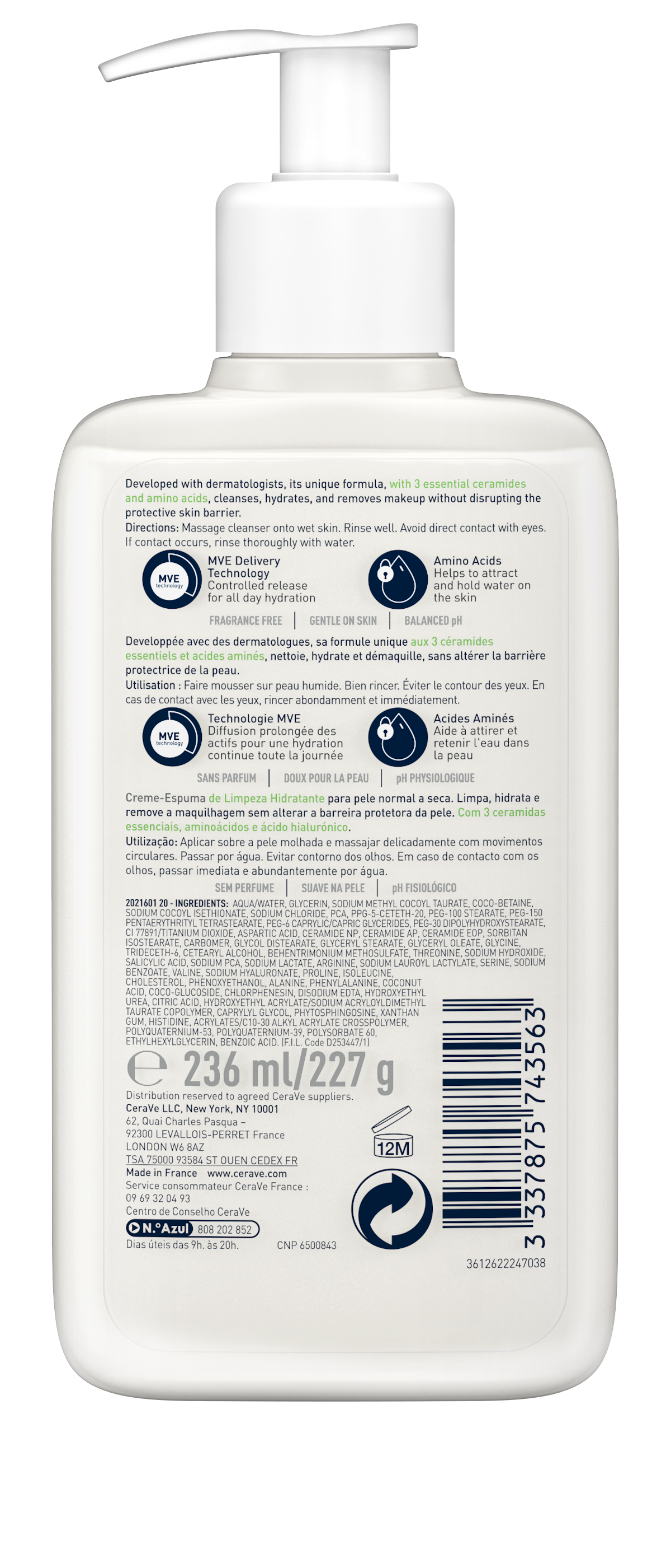 Elevate your daily skincare routine with CeraVe's Hydrating Cream-to-Foam Cleanser. Whether it's morning refreshment or evening cleansing, this product caters to your skin's needs, leaving it feeling clean, soft, and thoroughly moisturized.