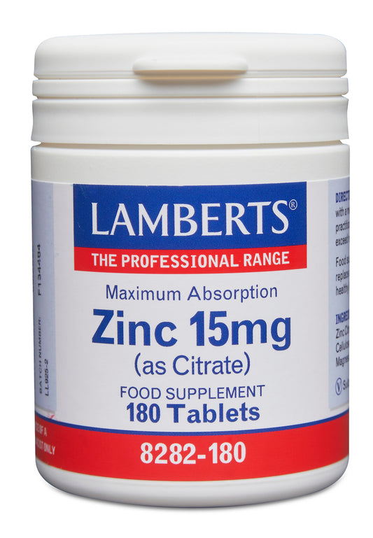 lamberts®zinc 15mg is an ideal supplement for long term use and the citrate form of zinc is known to be readily absorbed. these small easy to swallow tablets are made in the uk to pharmaceutical gmp standards. zinc is an essential nutrient and contributes to the normal function of the immune system normal fertility and reproduction and the maintenance of normal vision. it is also recognised as contributing to the maintenance of normal hair skin and nails. one in three adults in the uk receives less than the reference nutrient intake (rni) for zinc. this is largely a result of refining processes which remove up to 90% of the available zinc content from cereal grains along with the trend to eat less animal-derived protein. br/> daily intake: 1 tablet