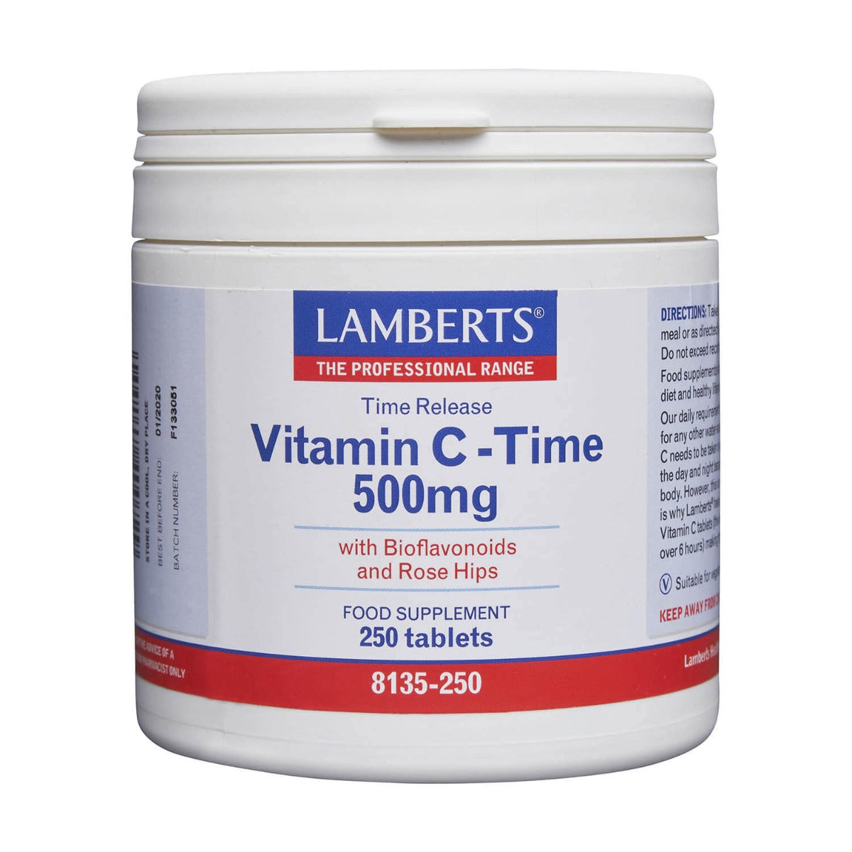 vitamin c is needed for a healthy immune system healthy bones teeth and gums as well as helping to maintain normal blood fat and cholesterol levels. our daily requirement for vitamin c is higher than any other water-soluble vitamin. ideally vitamin c needs to be taken in small amounts throughout the day and night because it is rapidly lost from the body. however this is not always convenient which is why lamberts® have formulated time release vitamin c tablets. these tablets are produced by a special process that retains the nutrient in micropellets allowing it to be released slowly after the tablet has been swallowed. this means that the absorption of vitamin c is a continuous process as the gradual release takes place over 6 to 8 hours. lamberts® time release vitamin c 500mg tablets also contain a relevant level of bioflavonoids because they are known to aid vitamin c absorption. bioflavonoids have also been demonstrated to have specific effects including a strengthening effect on the capillaries. a gradual release of vitamin c which replicates the natural process of food digestion a more stable level of vitamin c in the blood for a longer period a lower rate of excretion of vitamin c the beneficial effects of vitamin c available over a sustained period.