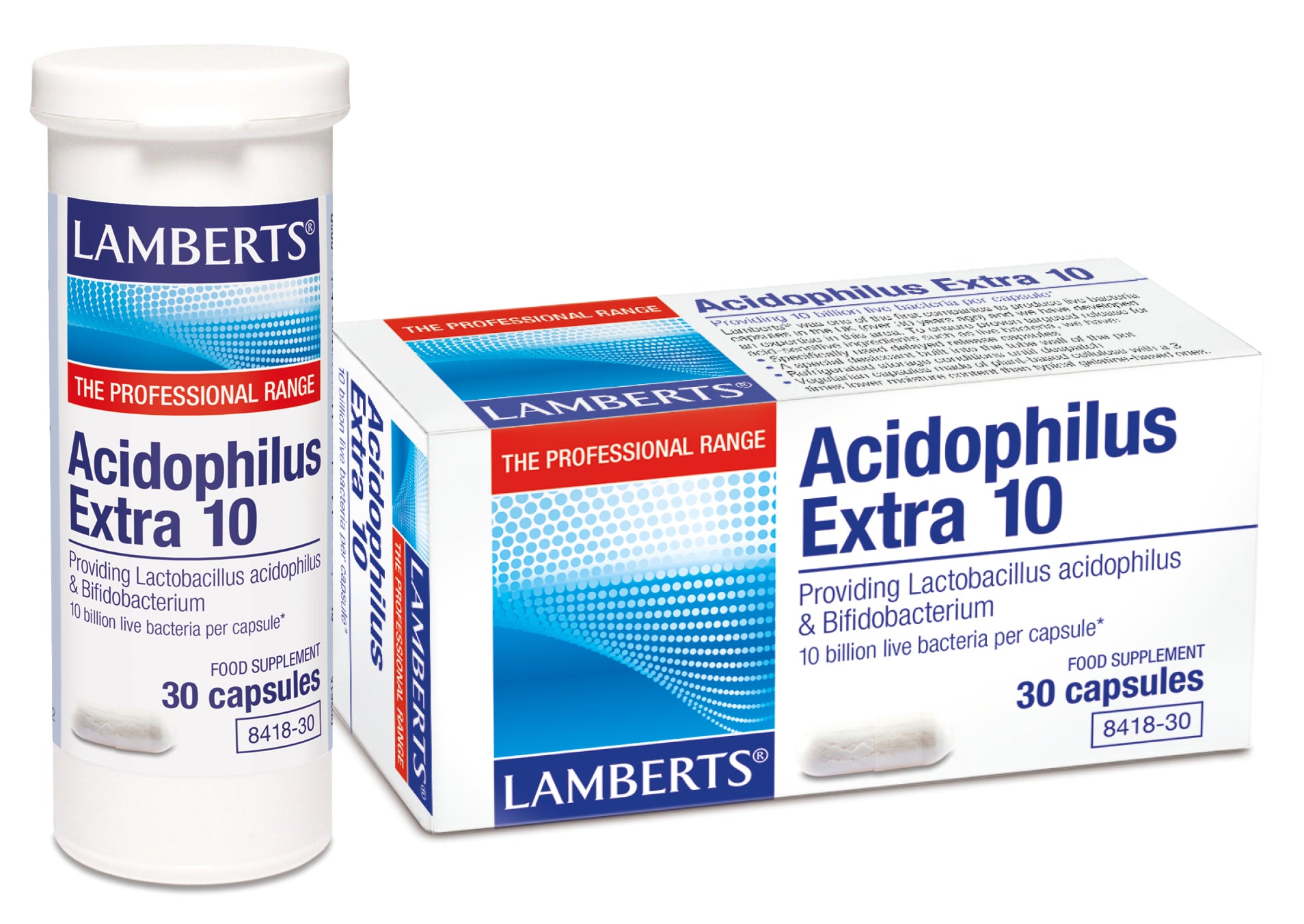 lamberts® acidophilus extra 10 contains 10 billion friendly bacteria. we use the beneficial lactobacillus acidophilus and bifidobacterium strains of bacteria. lamberts® was one of the first companies to produce live bacteria capsules in the uk (over 30 years ago) and we have developed expertise in this area. to ensure proven targeted release for acid-sensitive ingredients such as live bacteria we have: specifically used delayed release capsules a special desiccant built into the tube wall of the pot refrigerated storage conditions until despatch vegetarian capsules made of plant-based cellulose with 3 times lower moisture content than typical gelatine-based ones.