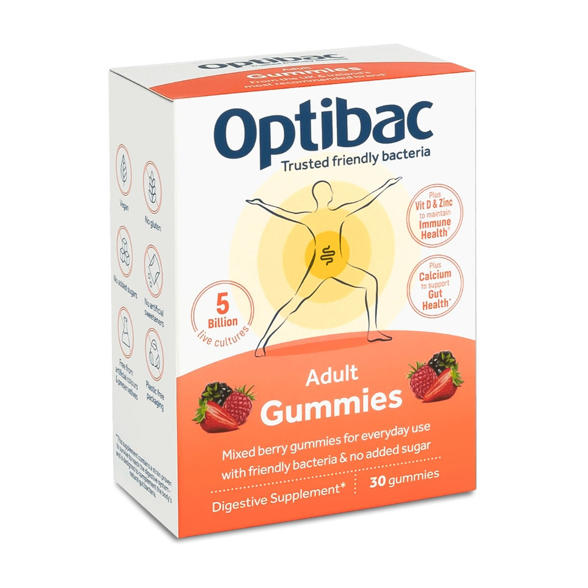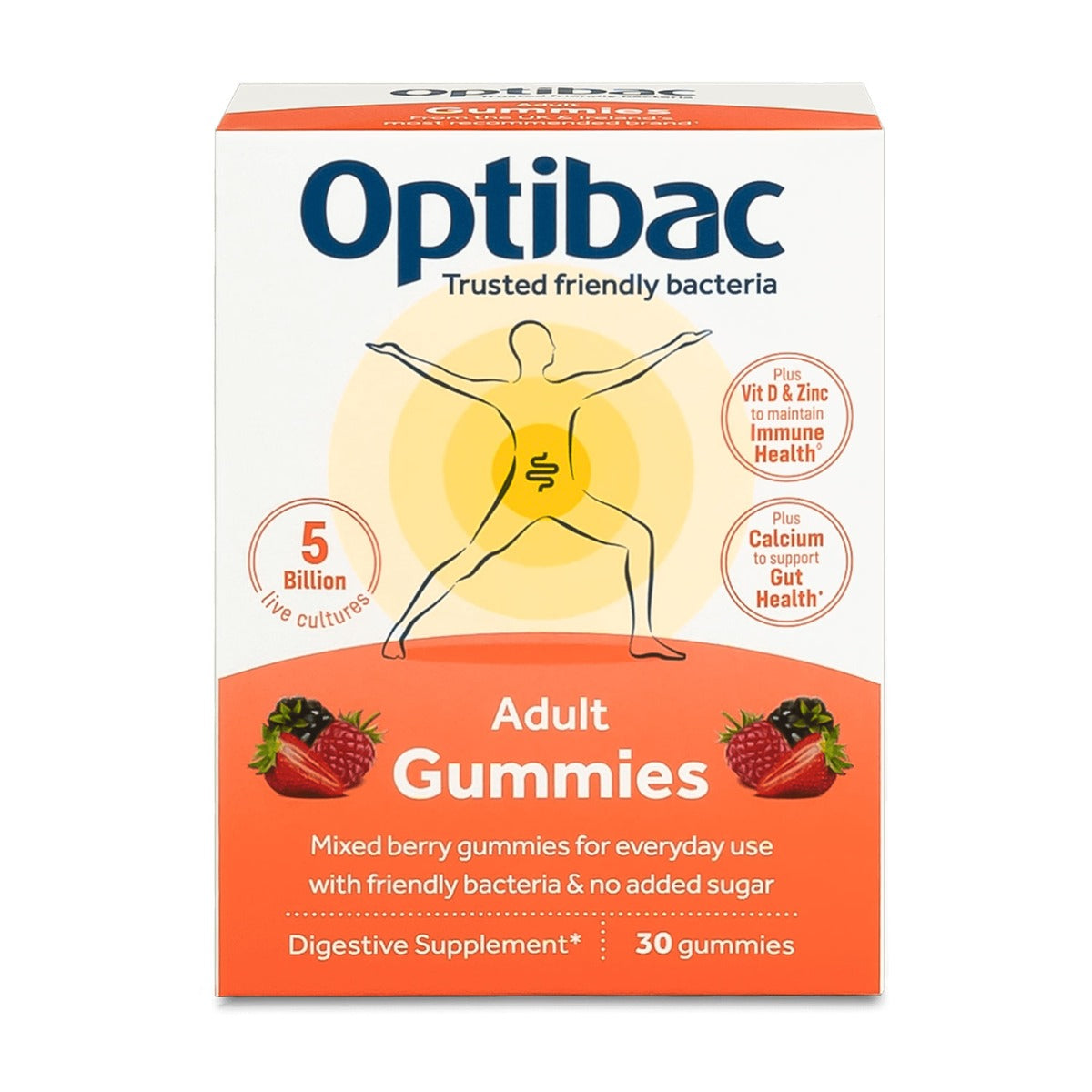 Naturally delicious fruit gummies supplement for adults, with highly researched friendly bacteria and FOS fibres, combined with your daily recommended intake of vitamin D plus zinc and calcium to support gut and immune health in one daily supplement.