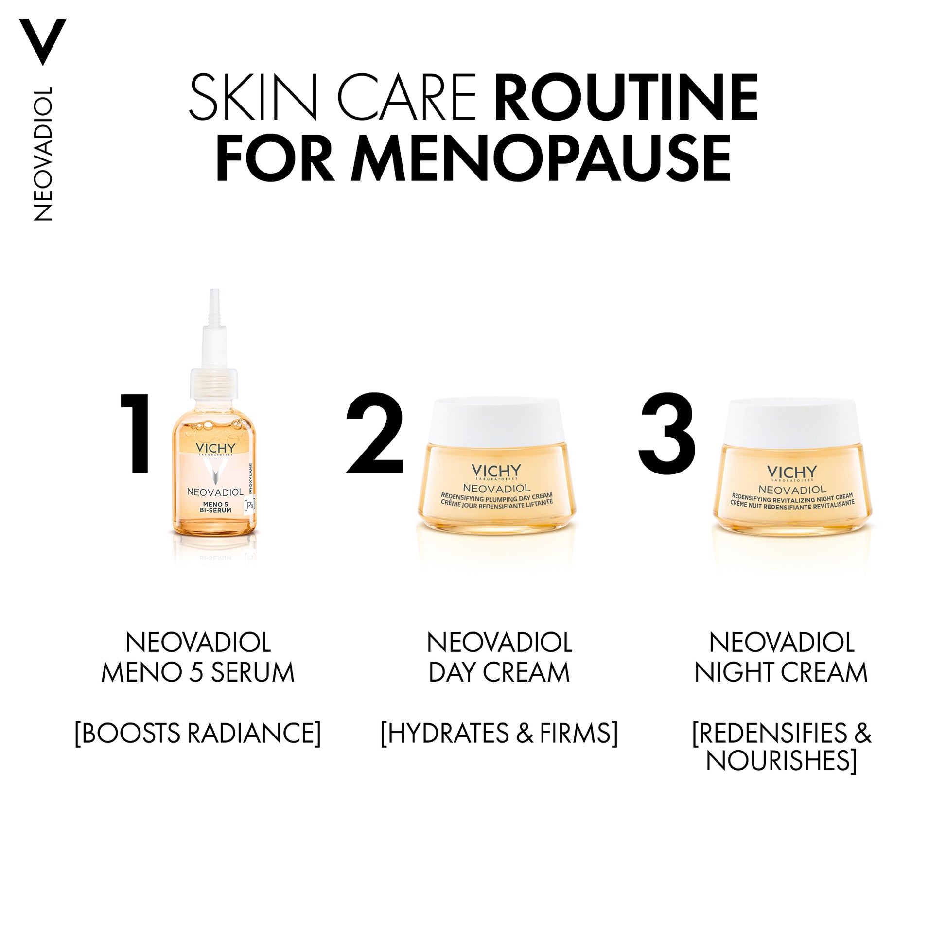 1. To cleansed skin apply Neovadiol Meno5 Bi-Serum using fingertips to gently massage the serum into the skin until fully absorbed.