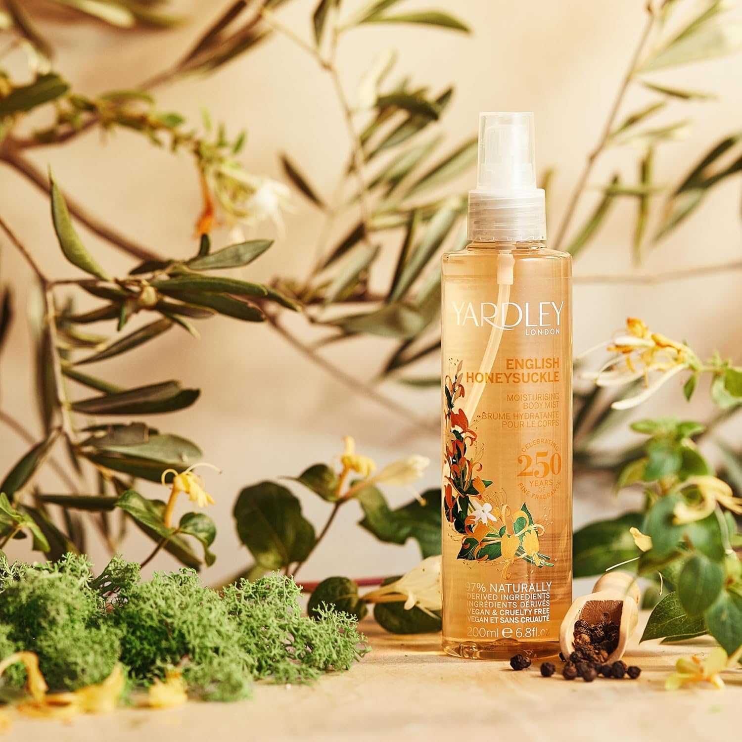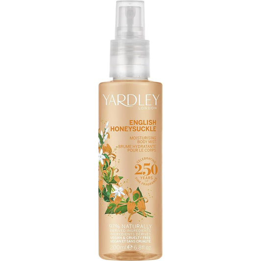 The Yardley London English Honeysuckle Body Mist (200ml) is a refreshing and fragrant mist that captures the delicate and uplifting scent of honeysuckle, reminiscent of a blooming English garden. This body mist features a light and airy fragrance with top notes of fresh citrus and bergamot, intertwined with the sweet, floral essence of honeysuckle. The scent is further enhanced by a subtle blend of jasmine, lily of the valley, and dewy green leaves, resting on a base of soft musk and smooth woods.